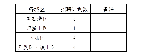 此次专项招聘拟面向黄石港区、西塞山区、下陆区、开发区·铁山区所辖街道范围内的在岗城市社区党组织书记公开招聘17名事业编制人员。具体情况如下: