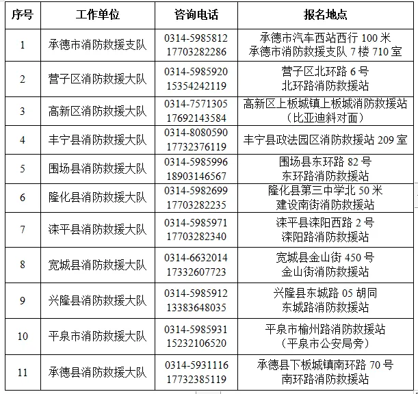 2.报名方式:此次招聘采取现场报名的方式进行,可在当地县区消防大队报名,也可在承德市消防救援支队报名,政府专职消防队员报名登记表详见附件2。