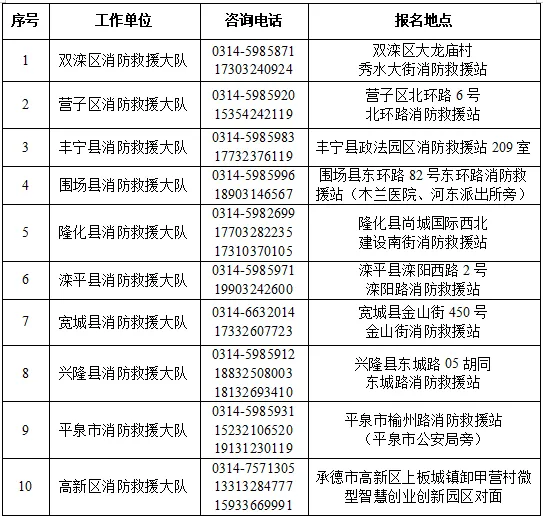 2025-04-22 19:19:16阅读()承德消防为满足承德市经济发展对消防救援力量的需求,加强和优化承德市消防救援力量,有效履行防范化解重大安全风险、应对处置各类灾害事故的责任使命,参照《河北省政府专职消防员管理办法》、《河北省消防救援总队政府专职消防员岗位等级评定办法(试行)》等政策法规,结合承德市灭火救援实际和工作岗位空缺情况,承德市消防救援支队现面向社会公开补充招聘政府专职消防队员,具体公告如下: