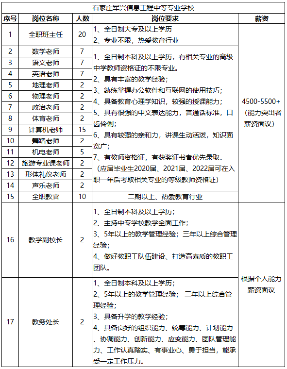 2022-06-05 21:50:58阅读()石家庄公共招聘网石家庄军兴信息工程中等专业学校地处河北省省会石家庄,成立于2003年,是一所经石家庄市教育局批准成立的国家统招全日制中专学校。随着学校规模的不断扩大和发展,拟面向社会公开招聘教职员工。现就有关事项公告如下: