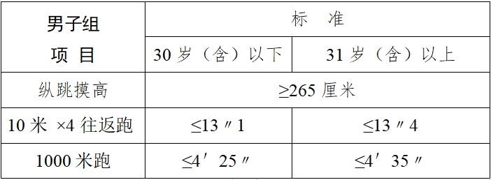 3.体能测评项目及标准:本次招聘体能测评共三项:纵跳摸高、10米×4往返跑、长跑(男子1000米跑)。体能测评参照《公安机关录用人民警察体能测评项目和标准(暂行)》执行,采取达标制。