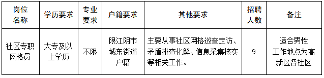 2024-05-25 10:12:05阅读()江阴人力资源公共服务网因工作需要,江阴高新区现面向社会公开招聘社区专职网格员9名,现将有关事项公布如下: