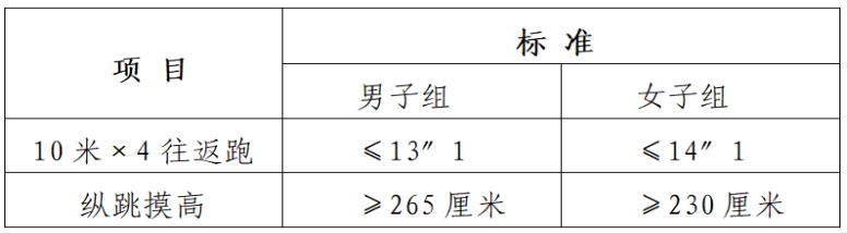 测评方法为:准备测试阶段,受测者双脚自然分开,呈站立姿势。接到指令后,受测者屈腿半蹲,双臂尽力后摆,然后向前上方快速摆臂,双腿同时发力,尽力垂直向上起跳,同时单手举起触摸固定的高度线或高度标识,触摸到高度线或者高度标识的视为合格。测试不超过三次。
