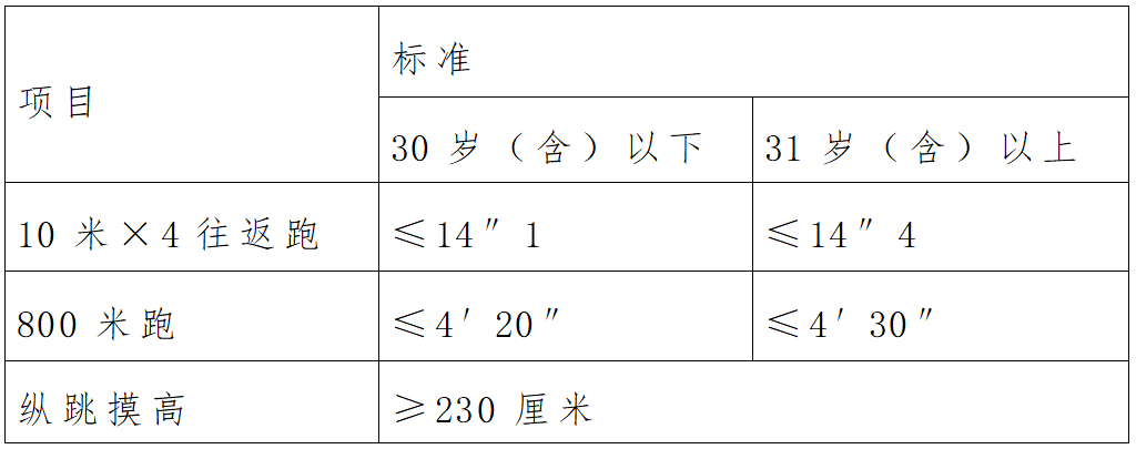注意事项:体能测试项目不进行复测。因体能测试不合格产生的职位空缺,在同职位笔试成绩合格者中按照从高分到低分的顺序依次递补(末位成绩并列者同时递补)。递补人员先进行资格复审,复审合格后参加体能测试,体能测试递补仅限一次。