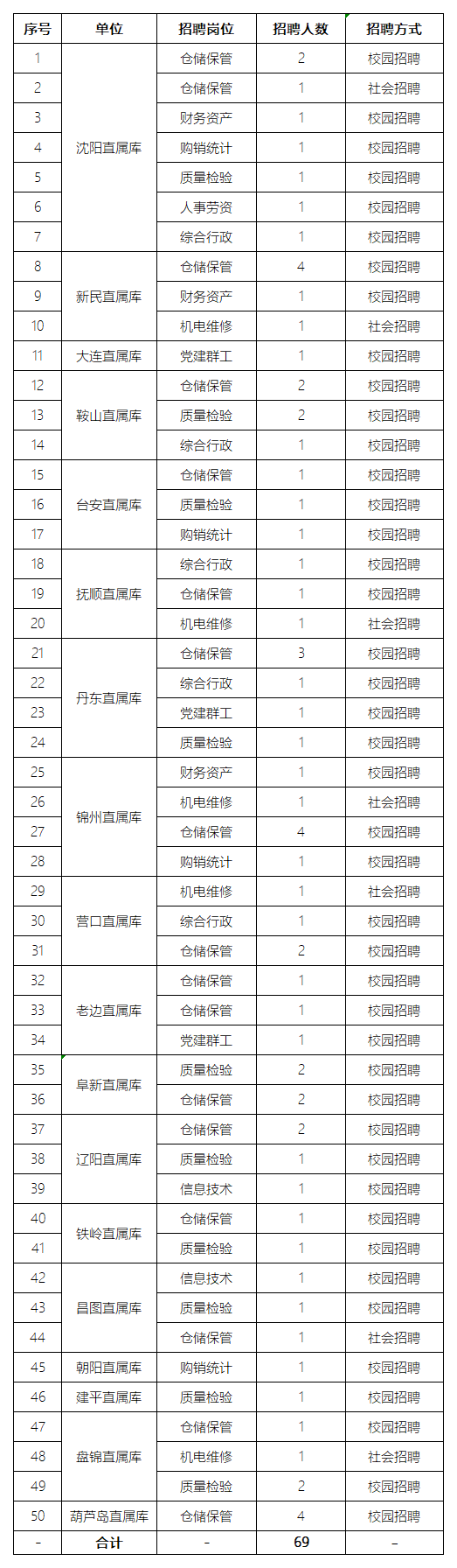 本次招聘为中储粮集团辽宁分公司辖区直属企业岗位。