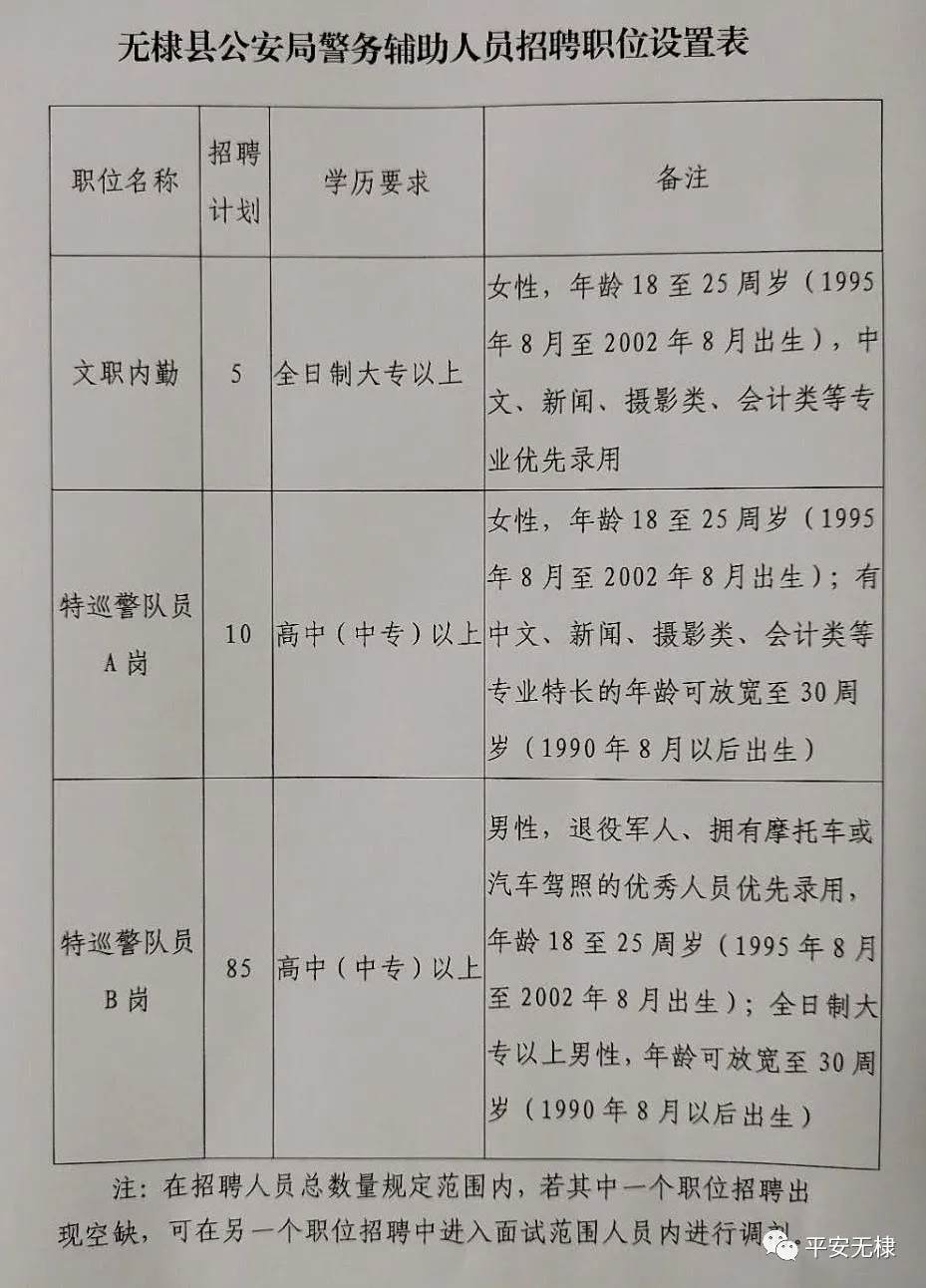 招聘职位详见《无棣县公安局警务辅助人员招聘职位设置表》(附件1)。