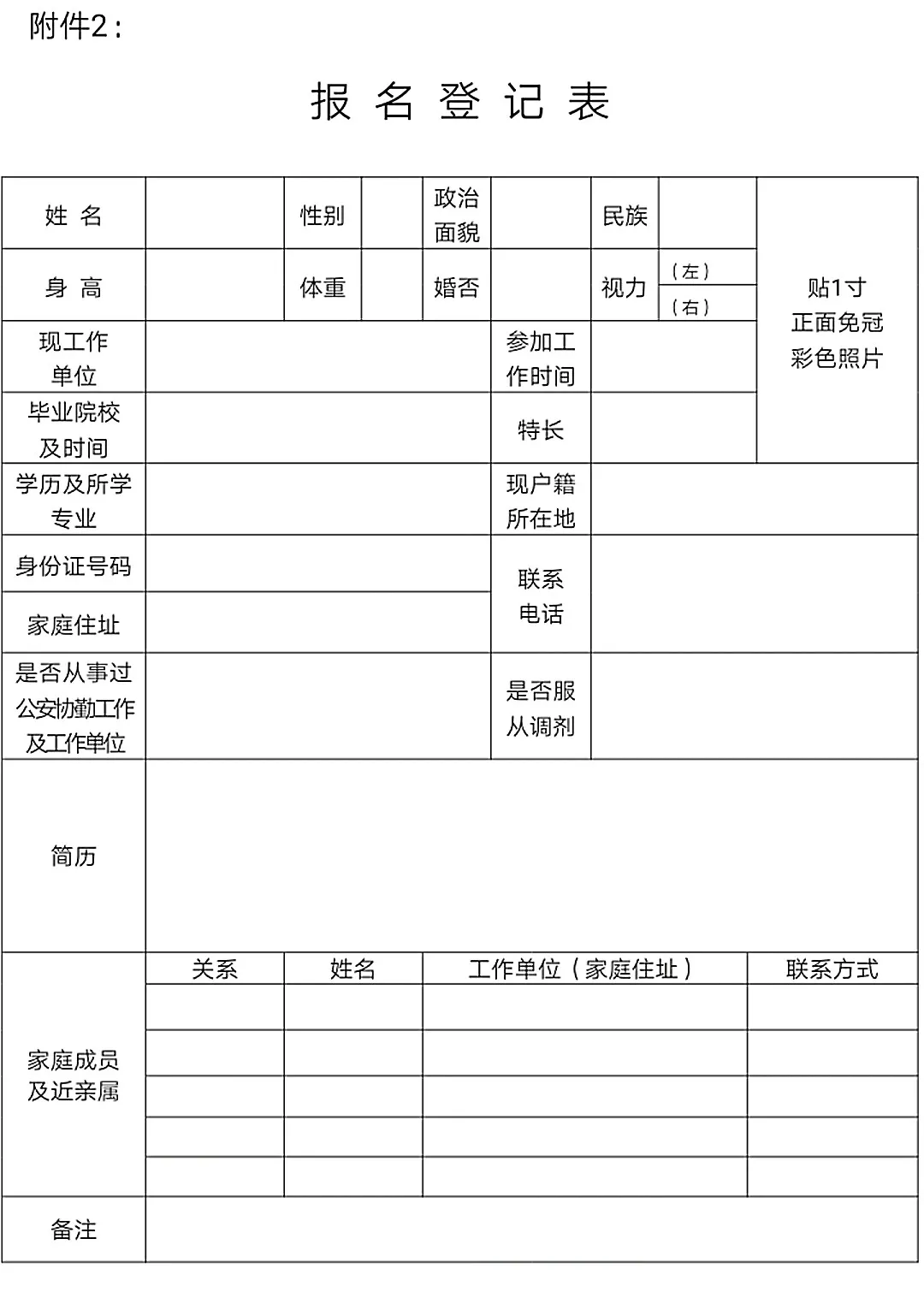 (三)报名要求:报名人员填写《报名登记表》(附件2)、《应聘诚信承诺书》(附件3),持本人有效期内身份证、户口本、国家承认的学历证书、个人信用报告、其他相关特长证明报名,退役军人持退出现役证(以上材料均须原件和复印件,大专及以上学历的请出具学信网《教育部学历证书电子备案表》)。报名时,交近期1寸同底免冠彩色照片3张(照片背面写上个人姓名)。