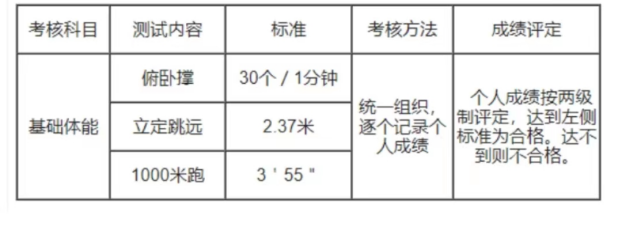 体能测试主要项目:1000米跑、仰卧起坐、立定跳远,各项目测试标准如下: