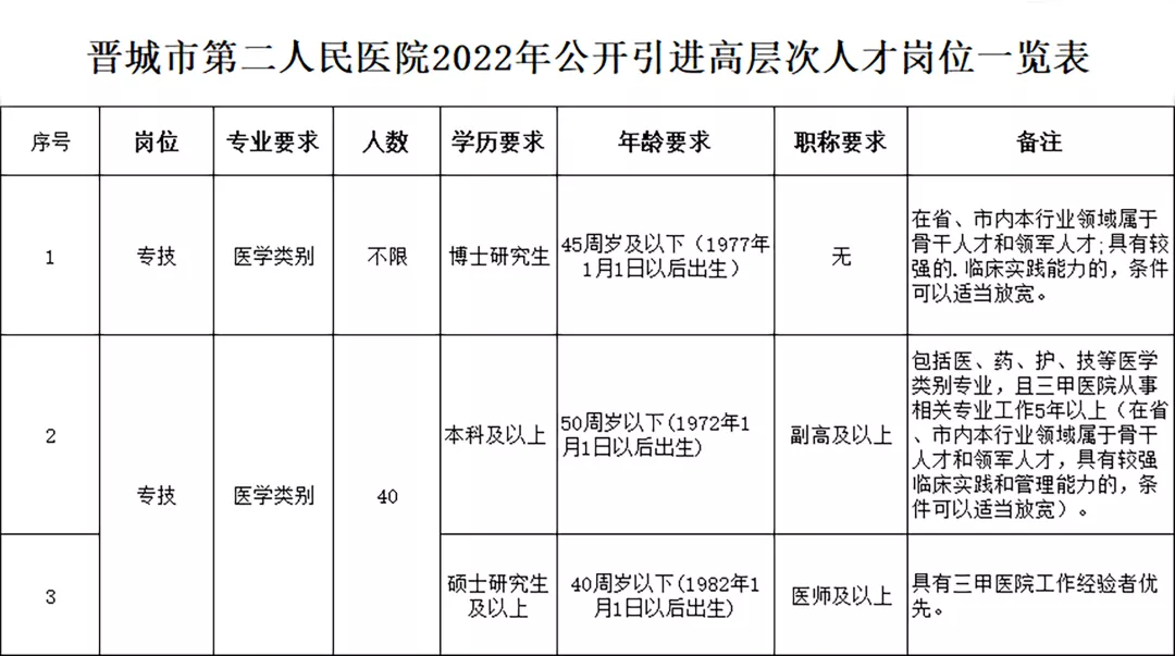 1、《晋城市第二人民医院2022年公开引进高层次人才岗位一览表》
