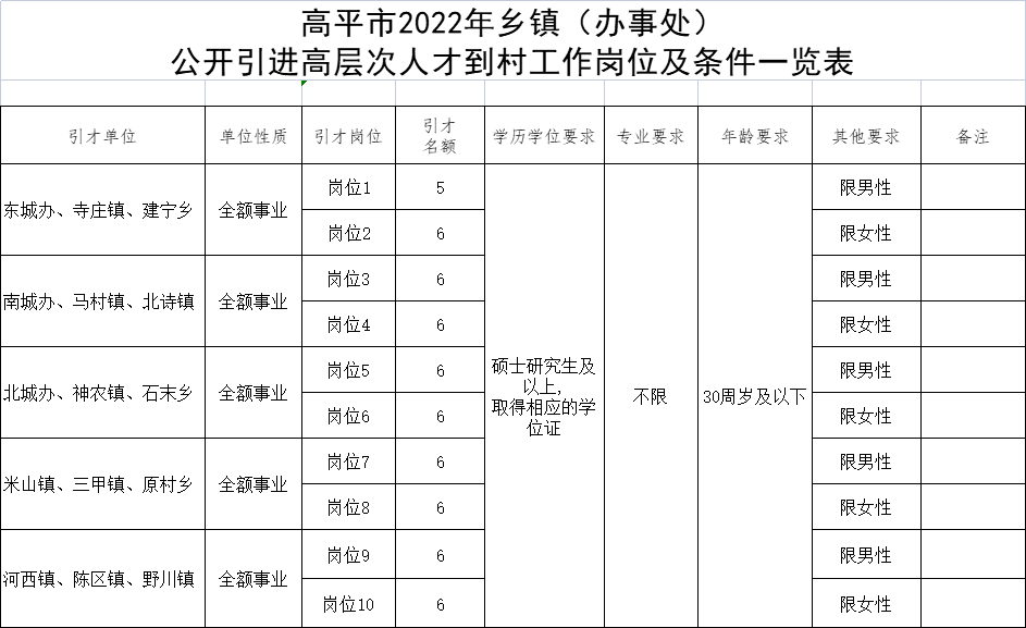 附件1:《高平市2022年乡镇(办事处)公开引进高层次人才到村工作岗位及条件一览表》