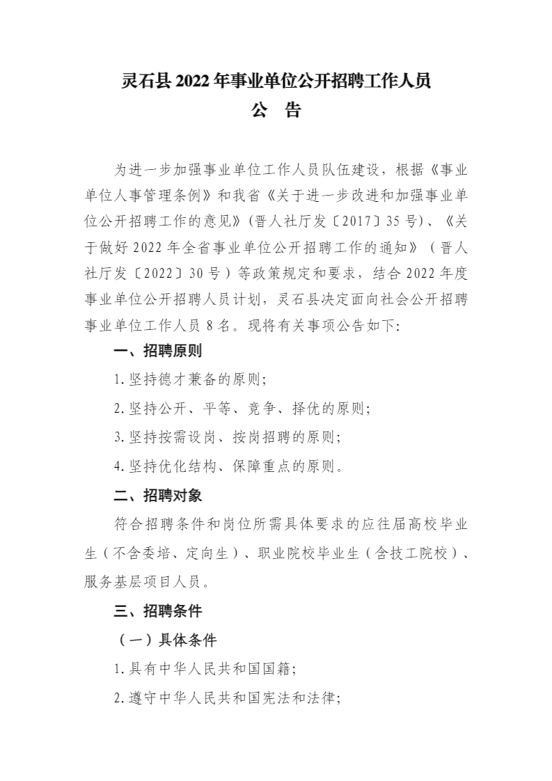 2022年晋中灵石县事业单位公开招聘工作人员公告