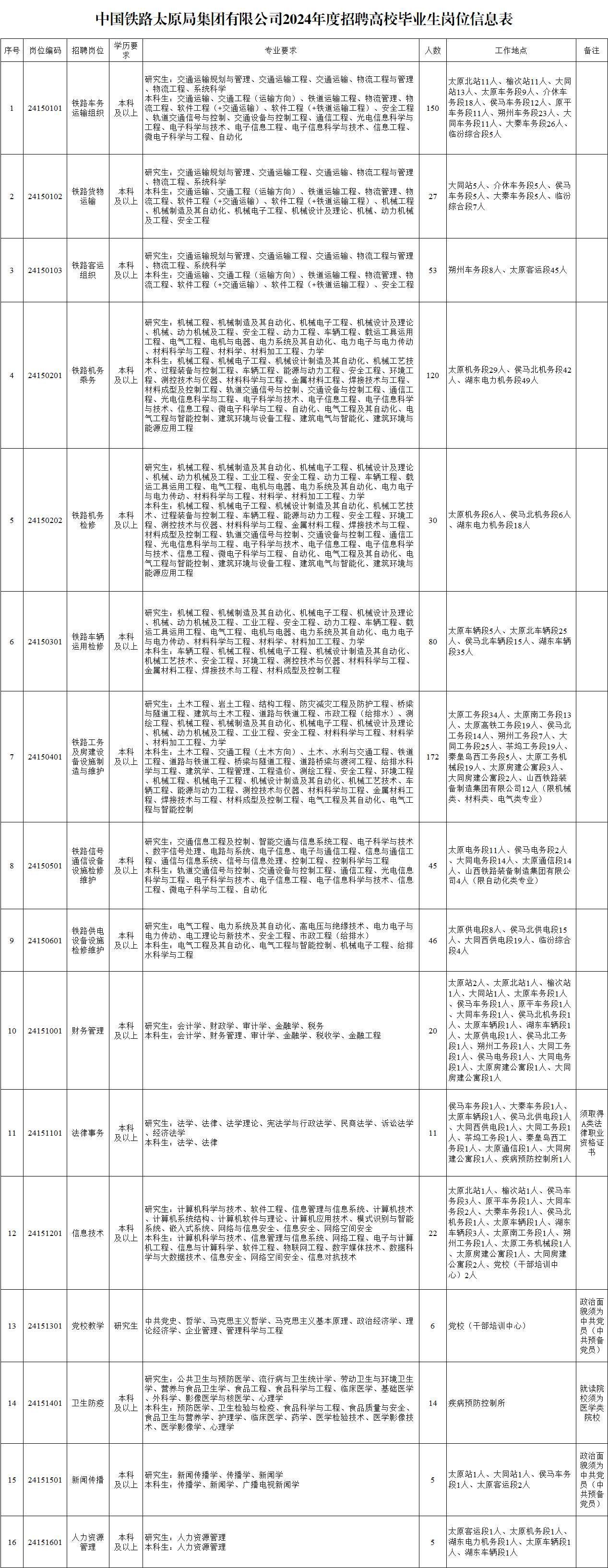 2023-11-28 21:23:08阅读()中国铁路太原局集团有限公司根据企业发展需要,现将2024年普通高等院校研究生和全日制本科学历毕业生招聘有关事项公告如下:
