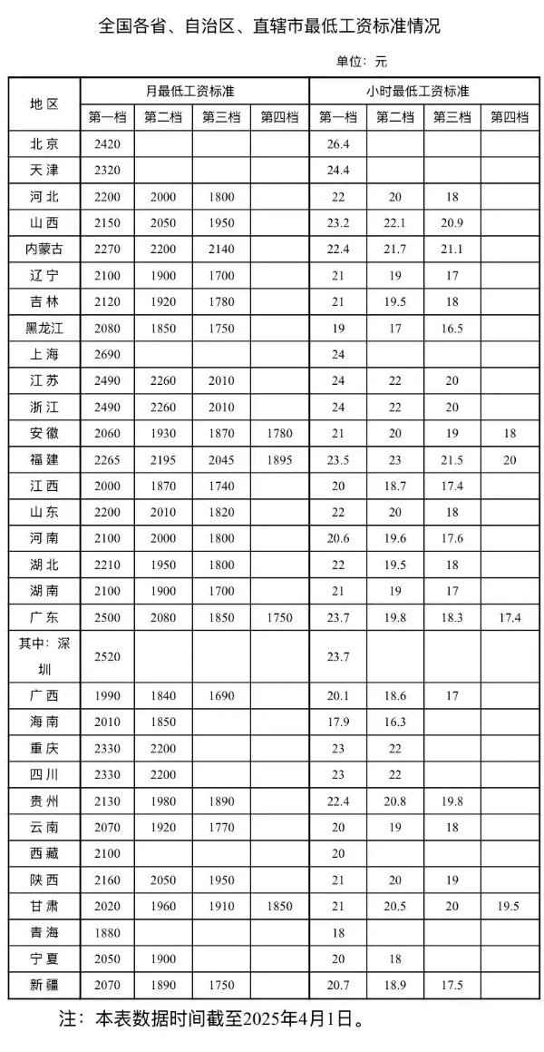 四川、重庆、新疆、山西也调整了最低工资标准,调整后的最低工资标准于2025年1月1日起执行。