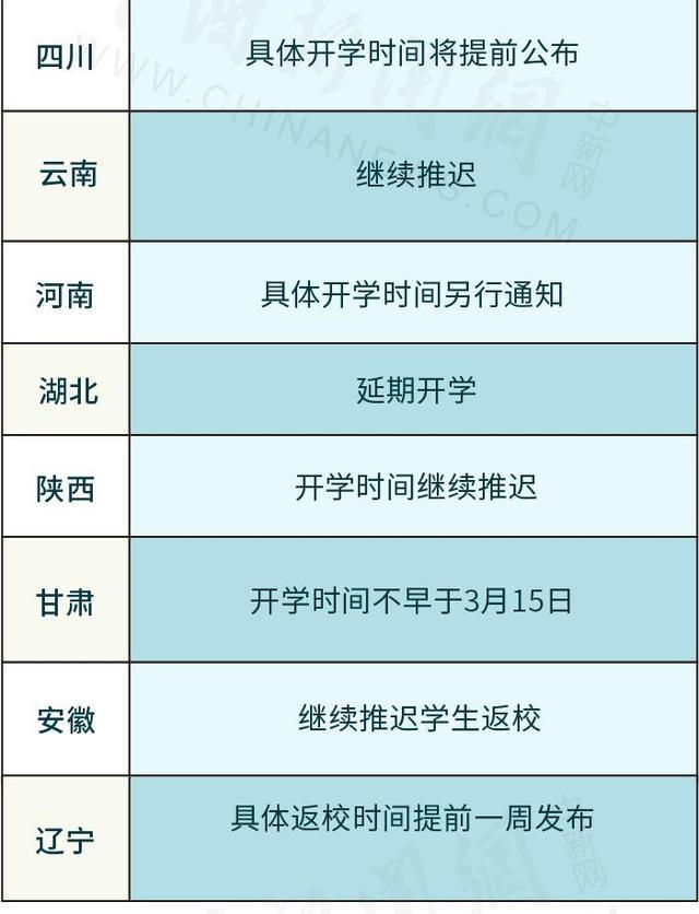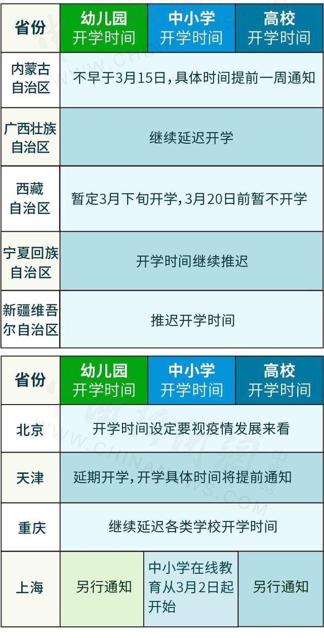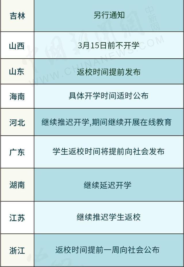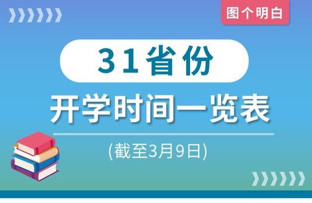 一图看明白!31省份开学时间一览表,随着疫情往好的方向发展,截止2020年3月10日已经有几个省、自治区相继清零,各中小学高校也开始做好开学准备,下图来自中国新闻网汇总的“31省份开学时间一览表”