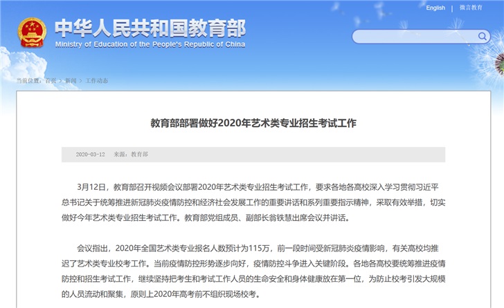 2020-03-12 17:21:03阅读()教育部今日,教育部发布了《教育部部署做好2020年艺术类专业招生考试工作》的通知,通知指出原则上2020年高考前不组织现场校考,在确保公平、公正的前提下,鼓励高校采取考生提交作品、网上视频面试等非现场考核方式进行考核。
