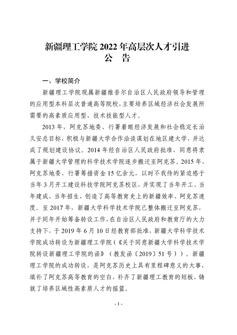 2013年,阿克苏地委、行署着眼经济发展和社会稳定长治久安总目标,积极与新疆大学合作洽谈谋划在地区建大学,并达成了规划建设协议。2014年经自治区人民政府批准,同意将隶属于新疆大学管理的科学技术学院逐步搬迁至阿克苏。2015年,阿克苏地委、行署筹措资金15亿余元,以时不我待的紧迫感于当年3月开工建设科技学院阿克苏校区,并实现了当年开工、当年建成、当年招生,创造了高等教育史上的新疆效率、阿克苏速度。至2017年,新疆大学科学技术学院已整体搬迁至阿克苏,并于同年开始筹备转设工作,在自治区人民政府和教育厅的大力支持下,于2019年6月10日经教育部批准,新疆大学科学技术学院成功转设为新疆理工学院(《关于同意新疆大学科学技术学院转设新疆理工学院的函》(教发函〔2019]51号) )。新疆理工学院的成功转设,是阿克苏历史上具有里程碑意义的大事,填补了阿克苏高等教育的空白,补齐了新疆理工教育的短板,铸就了培养区域性高素质人才的摇篮。