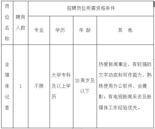 通过第三方劳务派遣方式招聘全媒体记者1名。