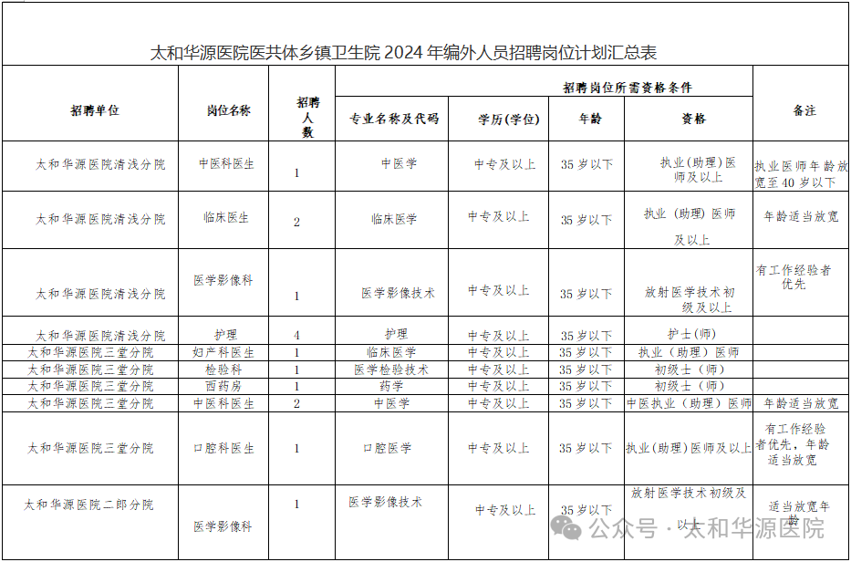详见太和华源医院医共体乡镇卫生院2024年编外人员招聘岗位计划汇总表。