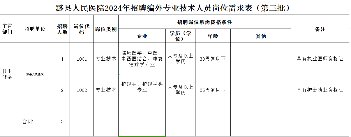 本次招聘共计2个岗位3名专业技术人员。详见《黟县人民医院2024年招聘编外专业技术人员岗位需求表(第三批)》