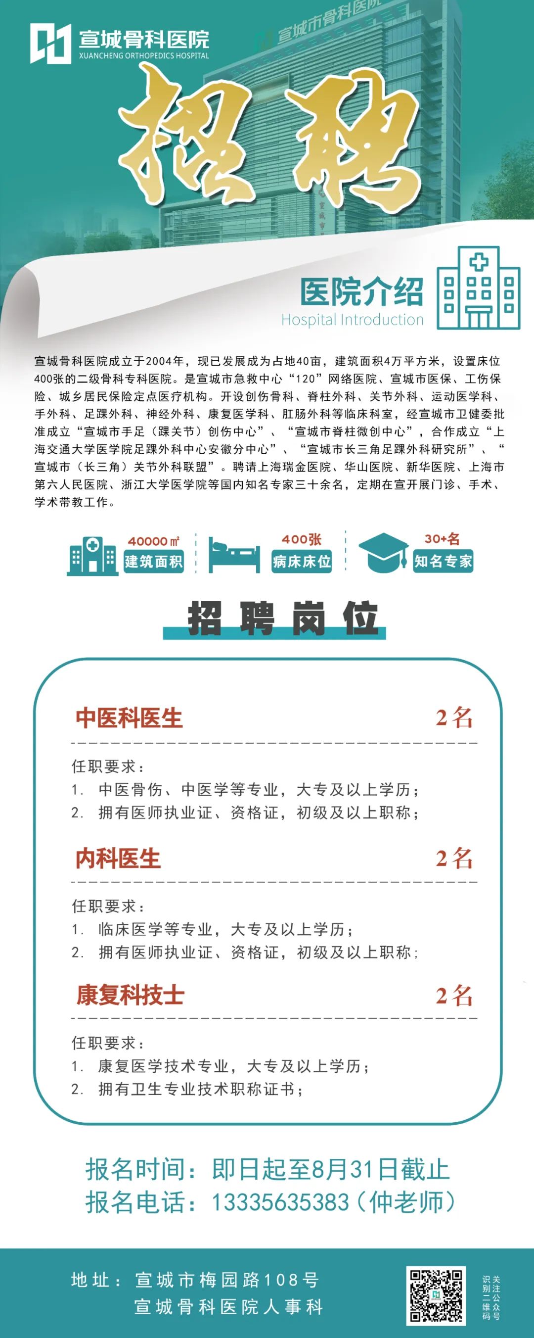 宣城骨科医院成立于2004年,现已发展成为占地40亩,建筑面积4万平方米,设置床位400张的二级骨科专科医院。是宣城市急救中心“120”网络医院、宣城市医保、工伤保险、城乡居民保险定点医疗机构。开设创伤骨科、脊柱外科、关节外科、运动医学科、手外科、足踝外科、神经外科、康复医学科、肛肠外科等临床科室,经宣城市卫健委批准成立“宣城市手足(踝关节)创伤中心”、“宣城市脊柱微创中心”,合作成立“上海交通大学医学院足踝外科中心安徽分中心”、“宣城市长三角足踝外科研究所”、“宣城市(长三角)关节外科联盟”。聘请上海瑞金医院、华山医院、新华医院、上海市第六人民医院、浙江大学医学院等国内知名专家三十余名,定期在宣开展门诊、手术、学术带教工作。