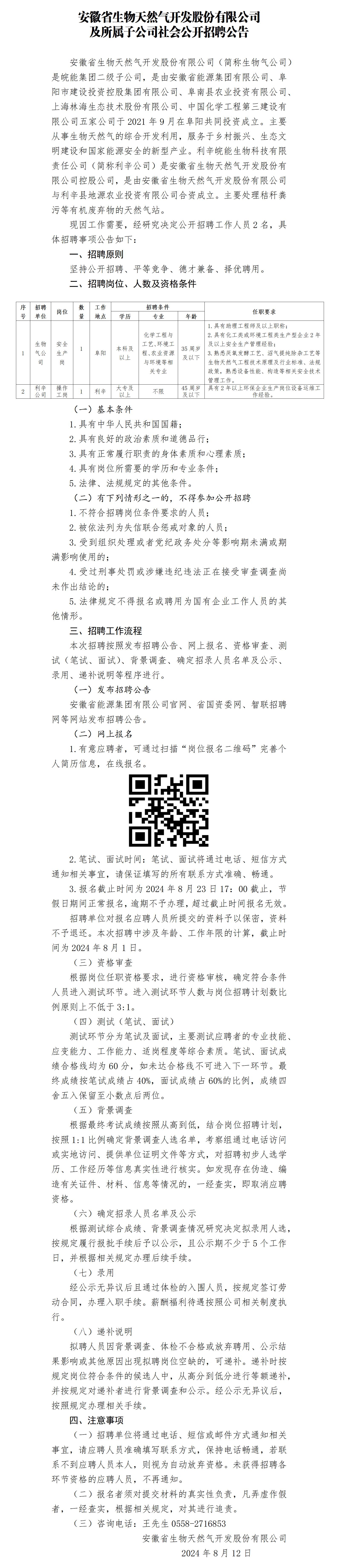 2024年阜阳安徽省生物天然气开发股份有限公司及所属子公司社会公开招聘公告