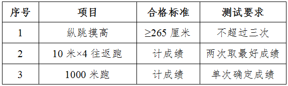 纵跳摸高不计成绩,纵跳摸高达到合格标准即视为合格,达不到合格标准者取消进入下一个环节资格。1000米跑、10米×4往返跑每项100分。1000米跑、10米×4往返跑两项成绩之和除以2(体测成绩保留小数点后两位)即为体能测评得分。应聘人员需对每项测评结果现场签字确认,体能测评成绩于测评结束后在正德人事考试网上服务平台(http://zhengdekaoshi.com/ )进行公示,并同时公布监督举报电话。