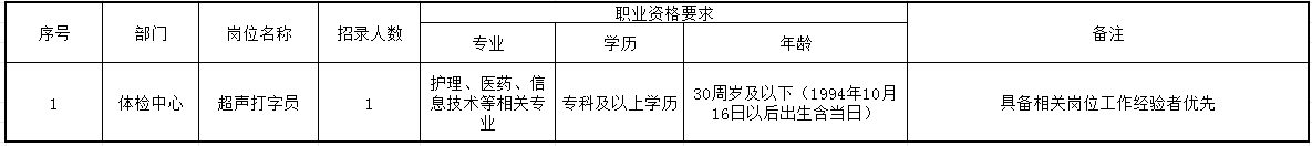 因工作需要,经研究决定,我司2024年面向社会公开招聘劳务派遣岗位人员1名,派遣至安庆市第一人民医院体检中心工作,现将有关事项公告如下: