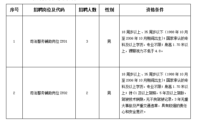 招聘方式:司法警务辅助岗位(ZY01)实行笔试、体能测试和面试、考察相结合的办法,司法警务辅助岗位(ZY02)实行笔试、体能测试、驾驶技能测试和面试、考察相结合的办法,按照发布公告、公开报名与资格初审、笔试、体能测试(或技能测试)、面试、体检、考察、公示、聘用等程序进行。