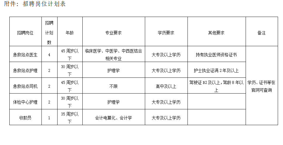 招聘急救站点医生4人,急救站点护理2人,急救站点司机2人,体检中心护理2人,收款员1人,合计11人,具体招聘岗位要求详见附件。