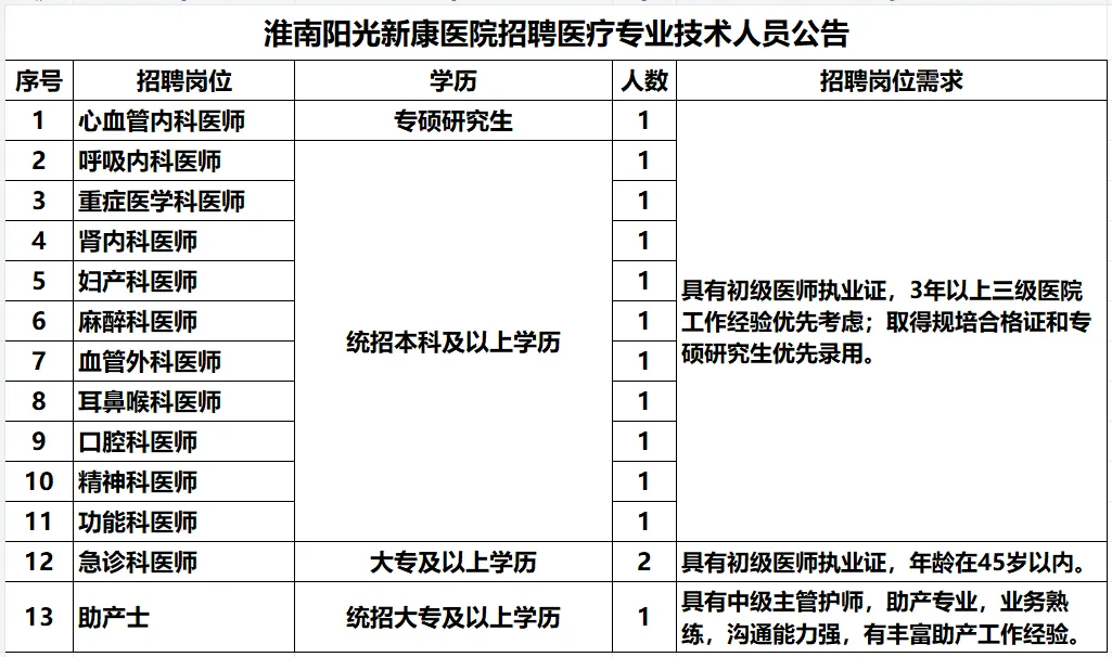 2024年淮南阳光新康医院医疗专业技术招聘公告