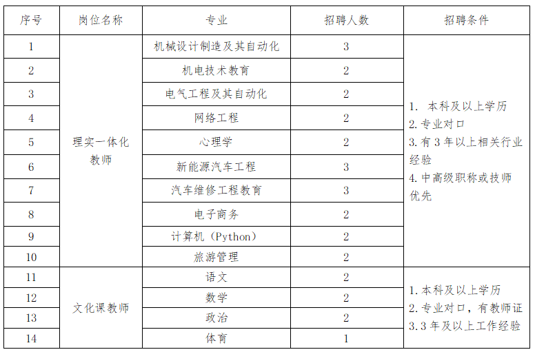 办学28年来,先后获批“国家级高技能人才培训基地”“国家人力资源和社会保障部(新能源汽车、工业机器人、汽车维修专业)‘工学一体’ 专业建设单位”“安徽省高水平专业群建设单位”“安徽省退役军人就业创业园”“安徽省技能等级评价试点单位”“安徽省首批优质技工学校”“安徽省校企合作示范校”“安徽省中等职业学校德育和校园文化建设工作先进集体”“1+X证书试点学校”等荣誉。在各级各类技能大赛中,均获得优异成绩,培养了数十万名技能型人才。现因集团发展需要,面向社会、高等院校招贤纳士,具体如下: