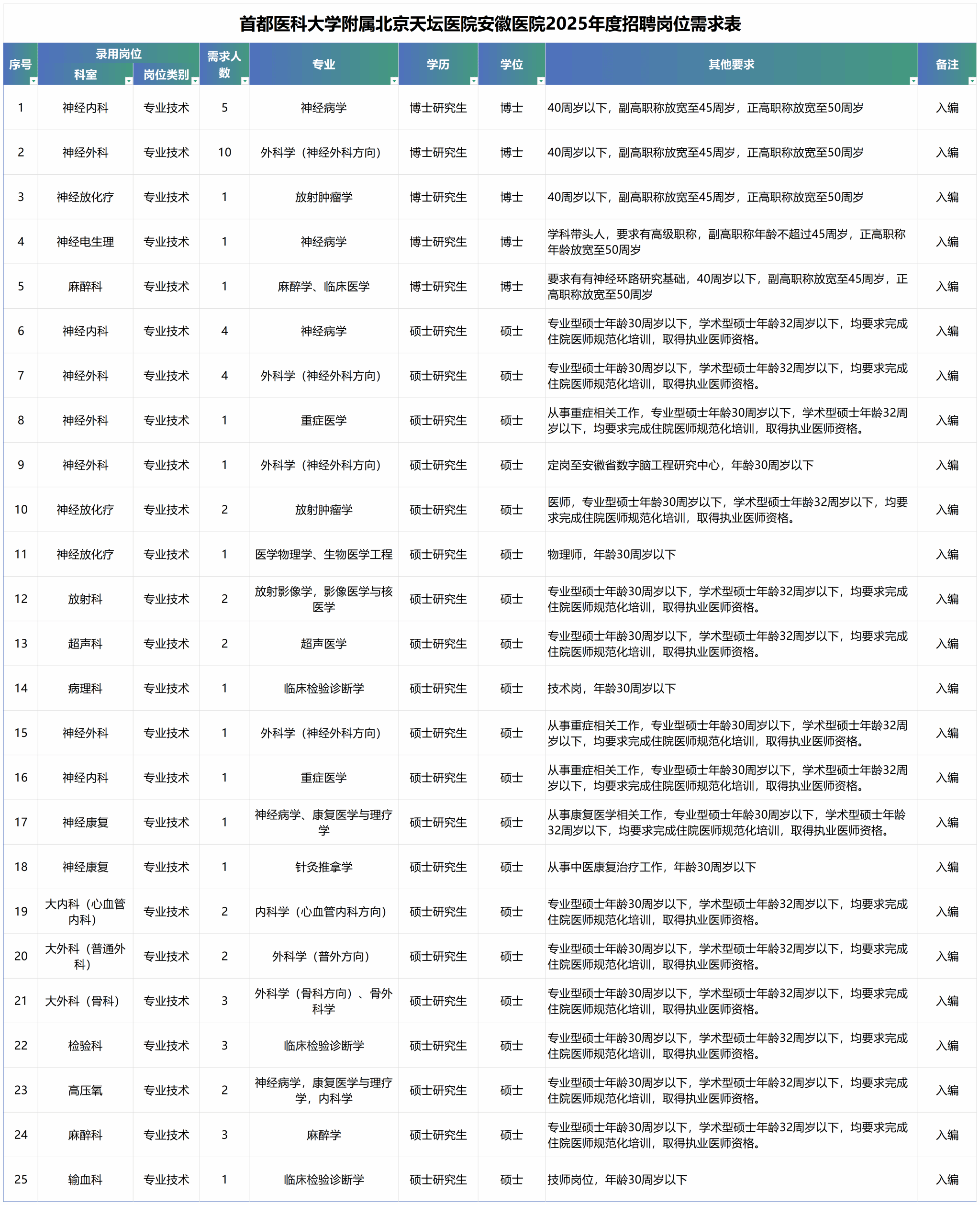 2025年度安徽医院公开招聘硕士及以上高层次人才56人,具体岗位信息详见下表: