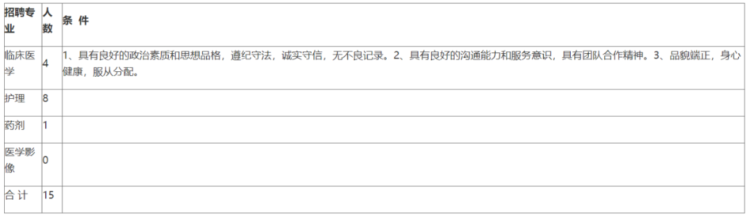 由于医院发展需要,现招聘临床、护理、医技等专业人士技术人员。具体如下:
