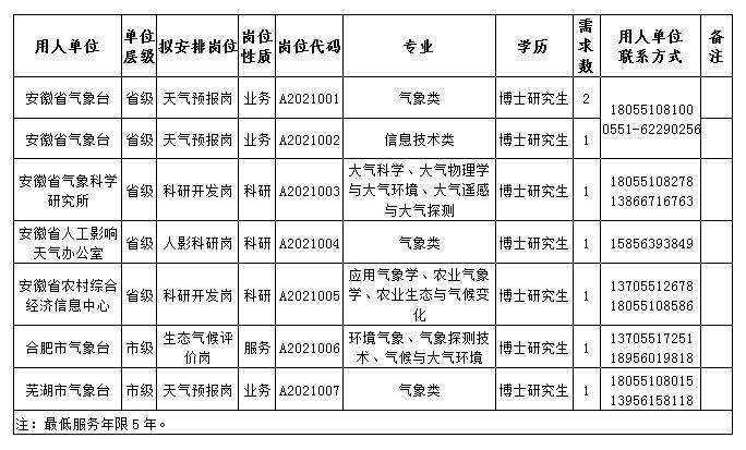 此次招聘岗位为博士岗位。具体单位、岗位、专业、学历要求等详见《安徽省气象局2021年度事业单位博士研究生岗位需求表》。