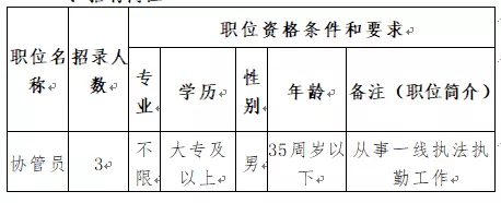 3、协管员具有符合职位要求的文化程度与工作能力,退伍军人可放宽至高中毕业学历,年龄可放宽至40周岁(1979年11月23日至2002年11月23日期间出生)。