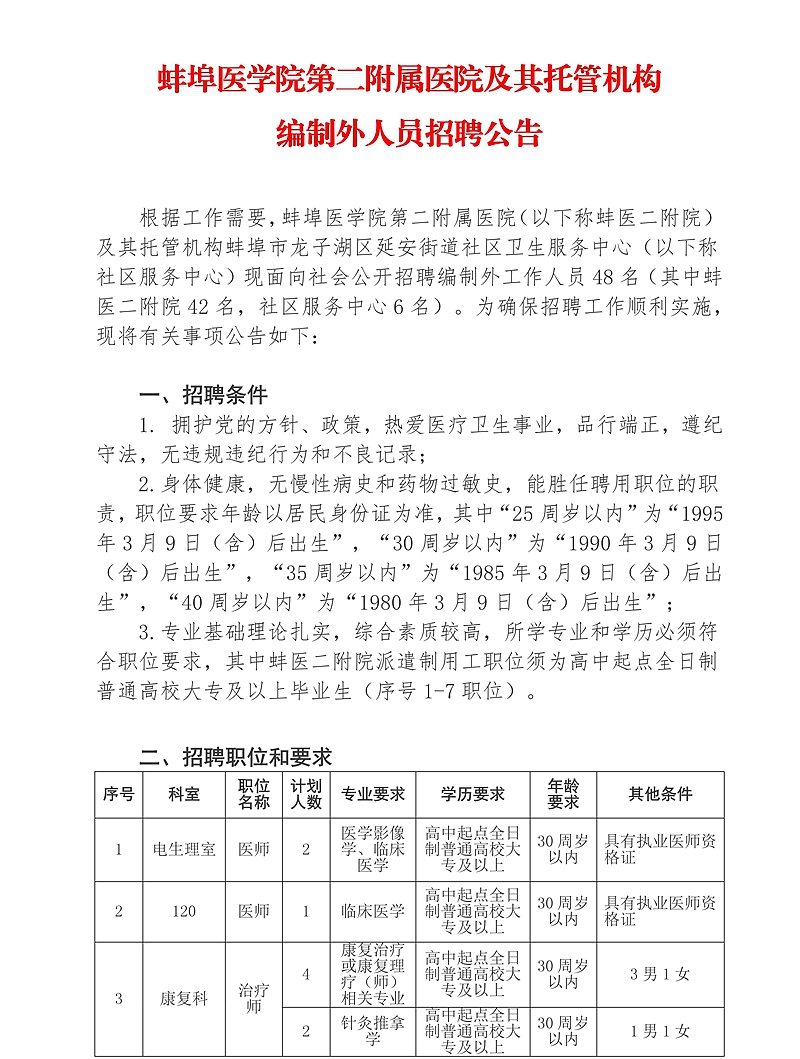 / 2020年蚌埠医学院第二附属医院及其托管机构编制外人员招聘公告