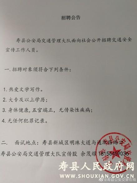 原标题:2020年寿县公安局交通管理大队招聘交通安全宣传工作人员公告