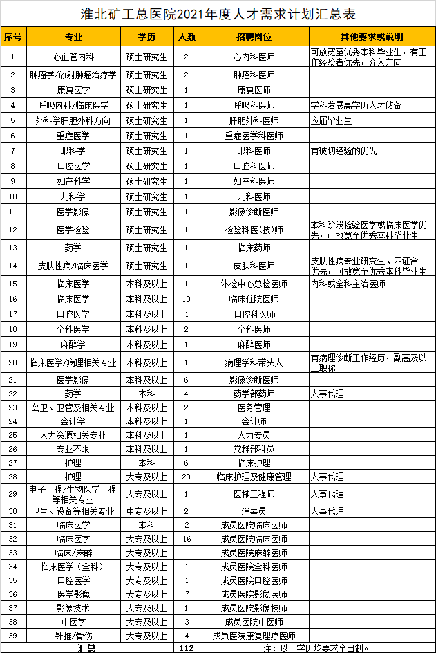 2021年淮北矿工总医院人才招聘计划(2021年2月修订)