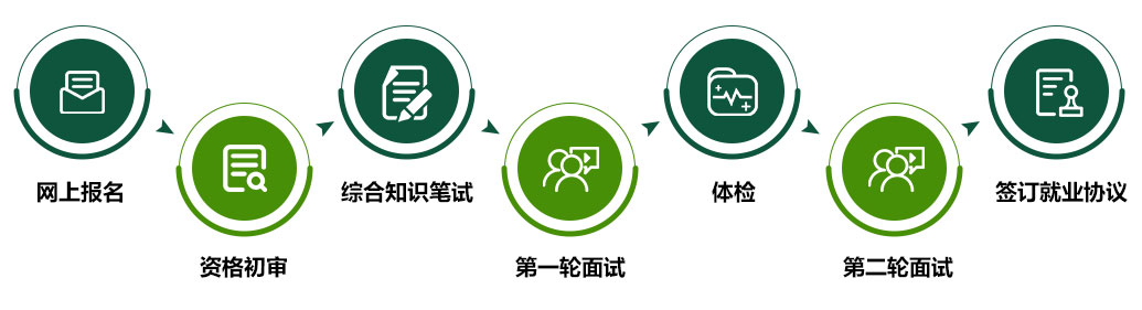 网上报名→资格初审→综合知识笔试→第一轮面试→体检→第二轮面试→签订就业协议。