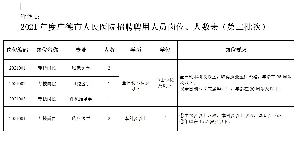详见《2021年度广德市人民医院招聘聘用人员(第二批次)岗位计划、条件一览表 》(附件1)。