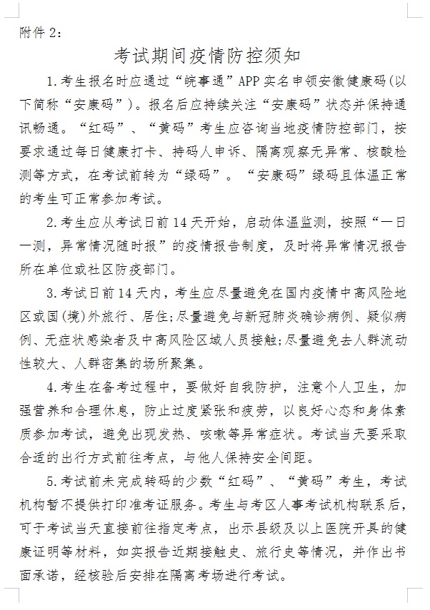 报考人员报名前,应通过“皖事通”APP实名申领“安康码”。报考人员报考前请认真阅读《考试期间疫情防控须知》(附件2)。报考人员提供的信息必须与本人实际情况、报考条件和所报考的岗位要求相一致。凡弄虚作假通过资格审查,其实际情况与报考条件规定不符的,一经查实,即取消考试、聘用等资格。