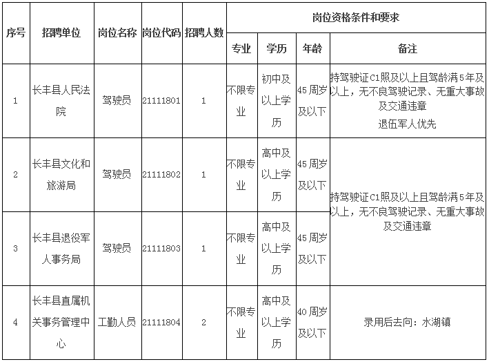 根据工作需要和有关规定,长丰县直属机关事务管理中心委托远创人力资源管理集团有限公司面向社会公开招聘驾驶员3名和工勤人员2名。现将有关事项公告如下: