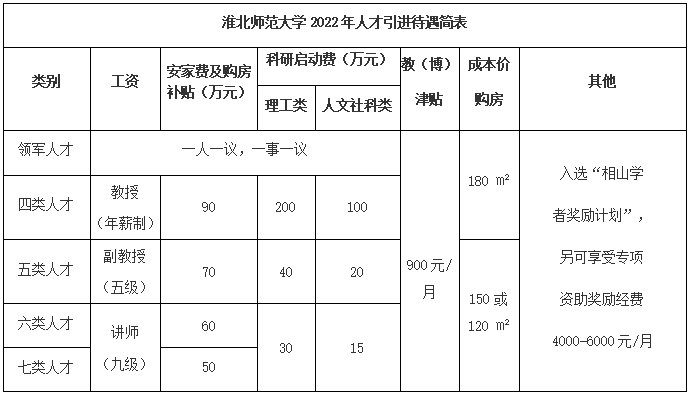 2. 四类至七类人才:引进的四类至七类人才享受《淮北师范大学人才引进待遇简表》中相应的安家费及购房补贴、科研启动费、教授(博士)津贴、成本价购房等待遇;其配偶具有学士及以上学位,可在校内安排工作。同时,聘期(6年)内入选“相山学者奖励计划”,另可享受专项资助奖励经费4000-6000元/月。引进人才的具体聘期任务及待遇以双方合同约定为准(教育部重点实验室聘用人才的待遇另行约定)。
