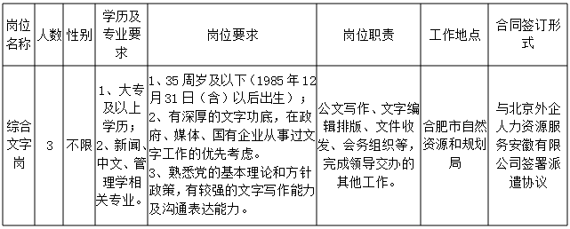 因工作需要,合肥市自然资源和规划局招聘政府购买岗位服务人员3名。具体如下 :
