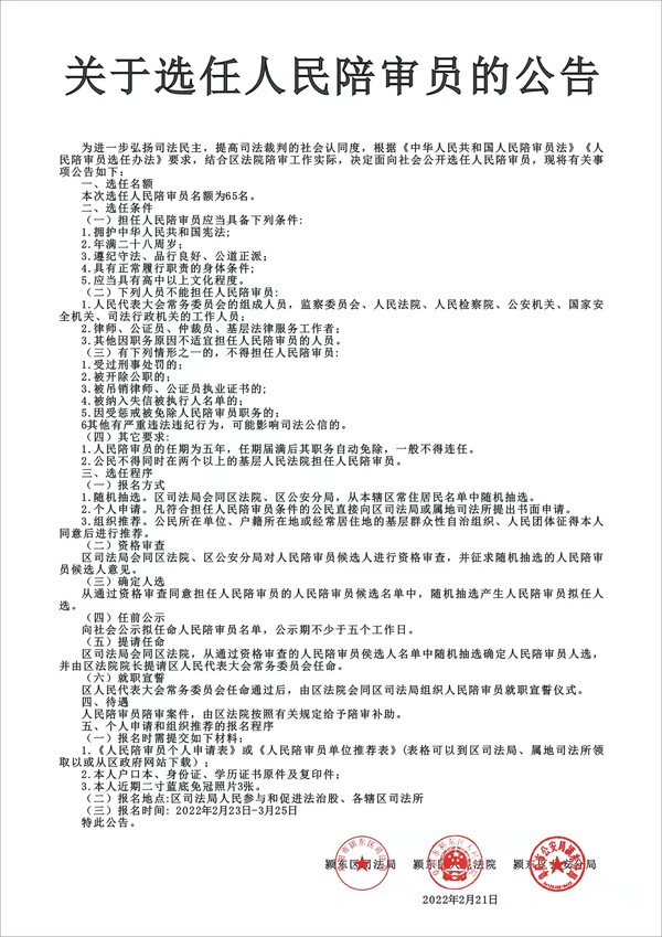 2022年阜阳市颍东区司法局选任人民陪审员公告