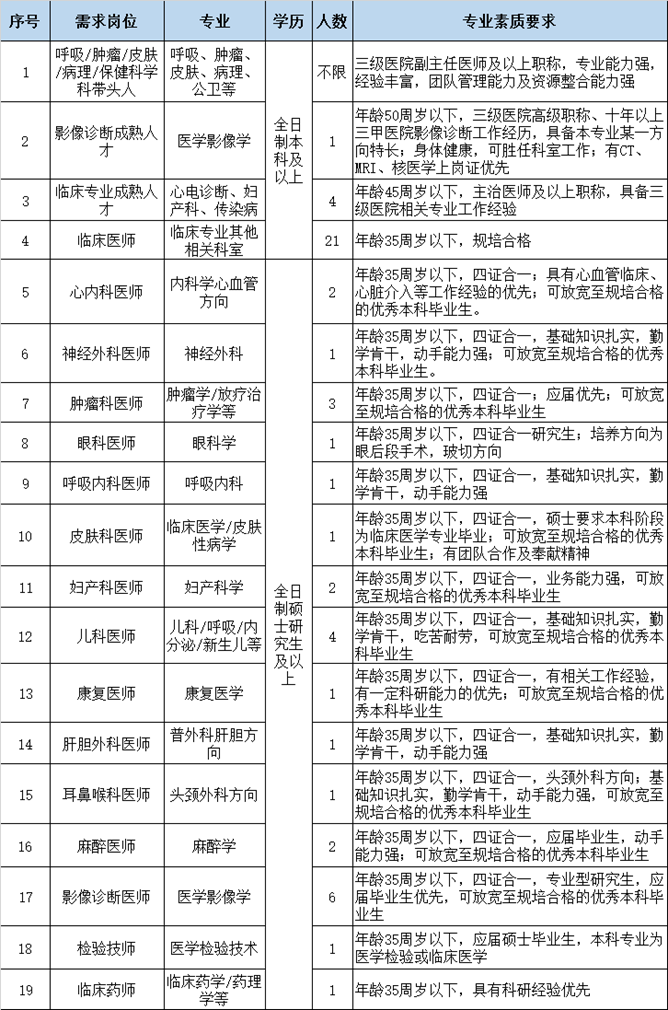 3、 “招聘岗位及要求”中未列出的专业岗位,优秀硕士及以上研究生和已规培人员也可以电话咨询或报名。