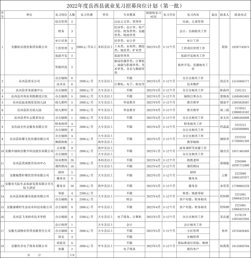 2022年5月前已征集第一批岗位174个,具体岗位情况、招聘条件、见习待遇及见习内容等见附件《2022年度岳西县就业见习招募岗位计划(第一批)》。