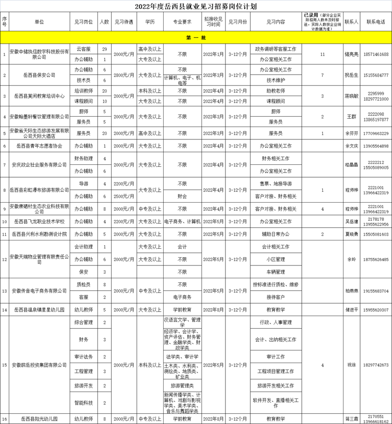 2022-06-10 23:08:50阅读()岳西县公共就业和人才服务局为深入贯彻落实省委省政府、市委市政府、县委县政府关于暖民心就业促进行动的决策部署,扎实推进高校毕业生等青年群体就业工作,县皖岳集团、保安公司等企业面向社会招收未就业高校毕业生或失业青年参加就业见习,现将有关事项公布如下: