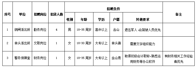 林头派出所、警务保障室各招1名文职警务辅助人员,铜闸派出所招4名勤务警务辅助人员,具体要求详见附件。