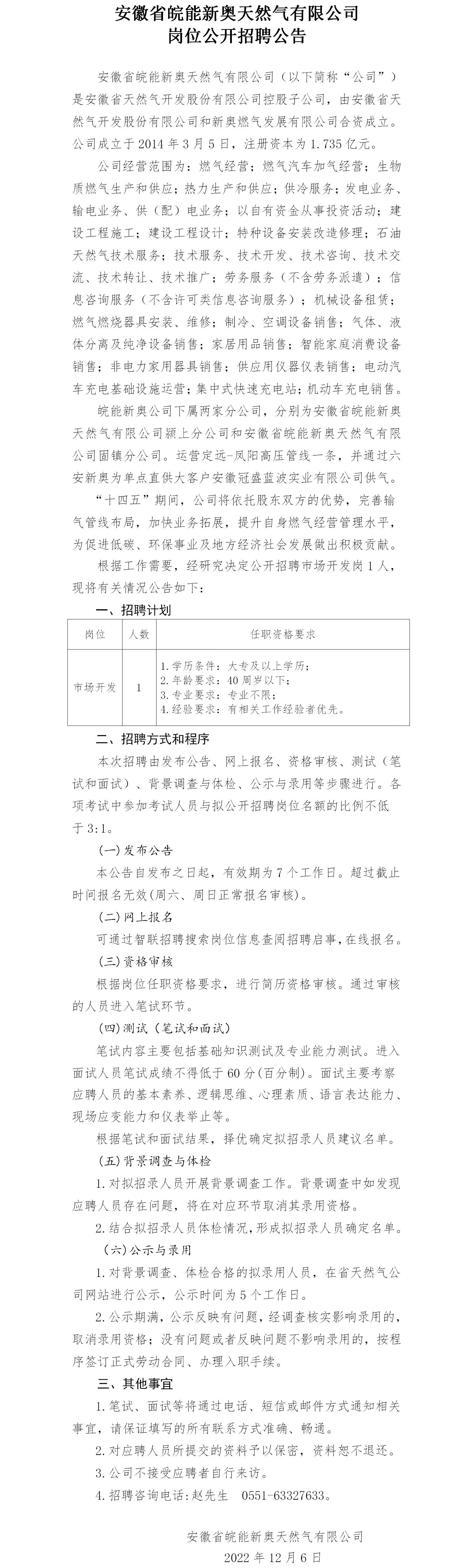 2022年安徽省皖能新奥天然气有限公司岗位公开招聘公告